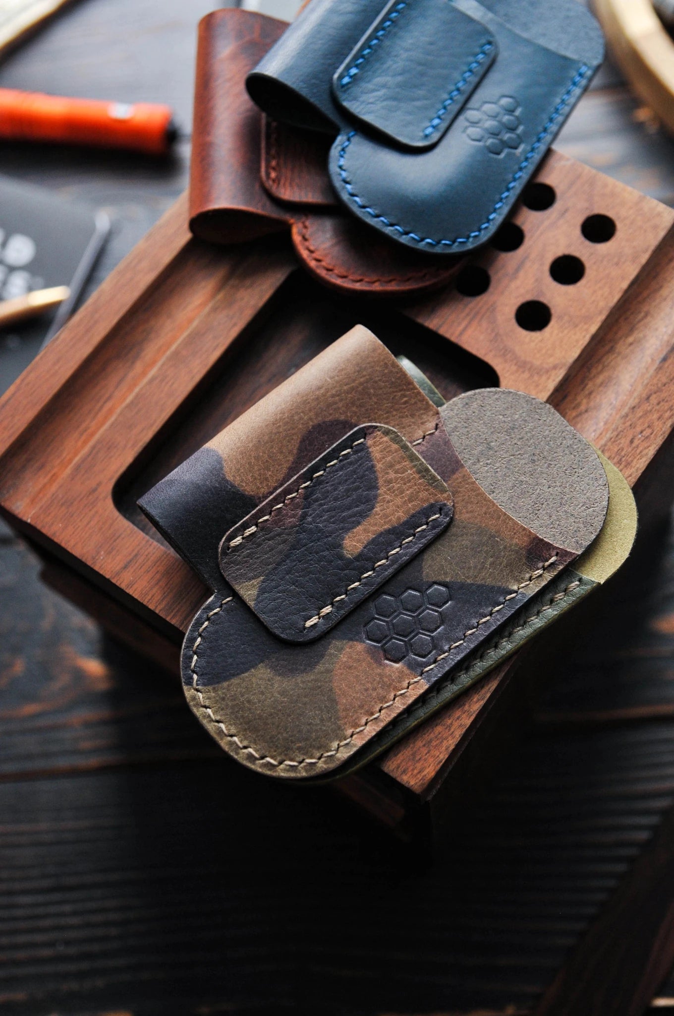 This everyday carry organizer is made from 1.4 mm (3.5 oz) thick vegetable-tanned full-grain leather. This durable leather will not only last a long time, but will also improve with age.