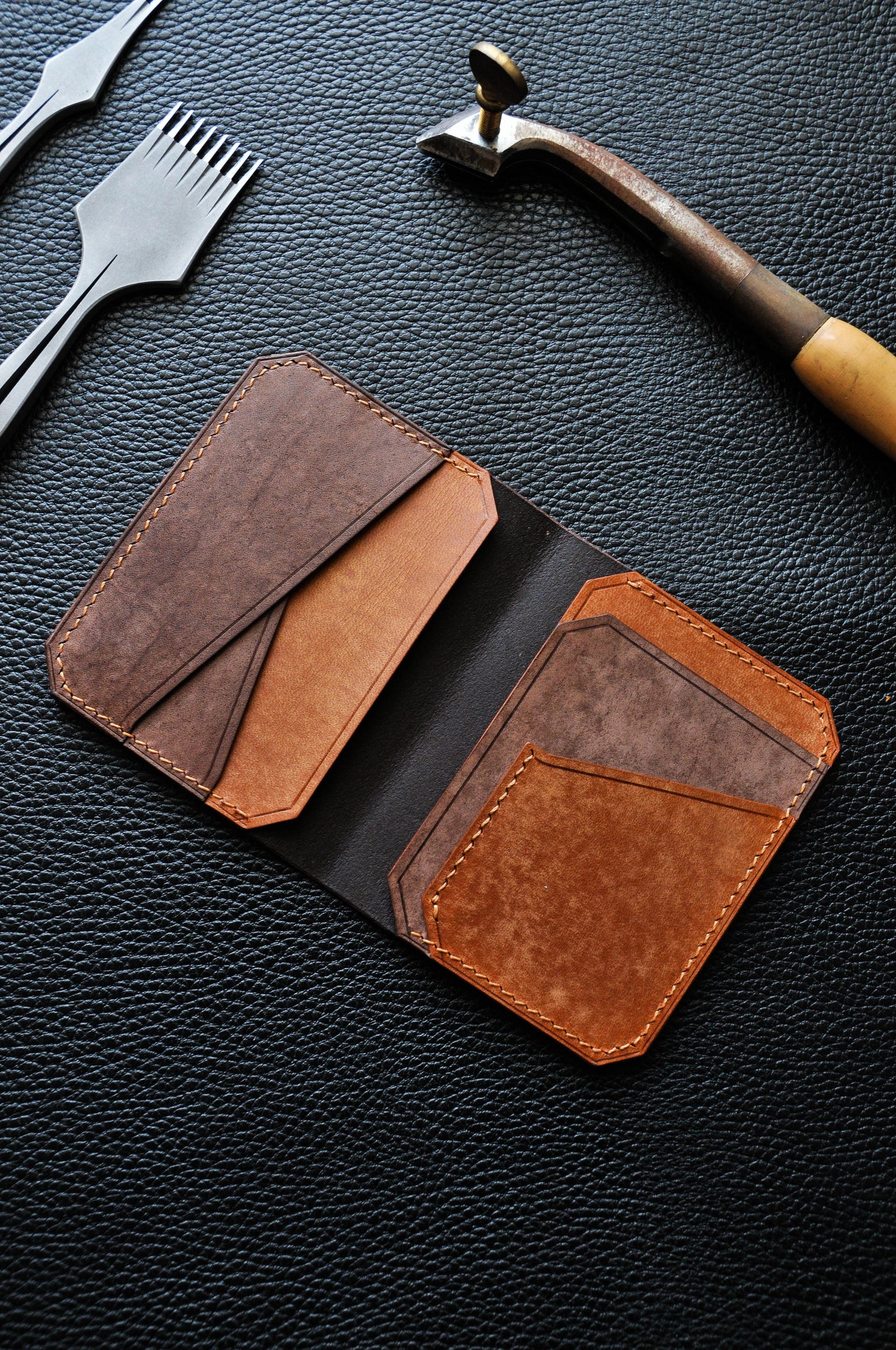 Stylish compact wallet with wide functionality. The accessory does not take up much space and fits in your pocket. The model is suitable for both men, women and children. The product is made of Italian buttero leather from the Walpier factory. It is one of the oldest tanneries in Italy, producing quality vegetable tanned leather. The factory is located in the historic area of Tuscany, where the heart of Italian leather production is located.