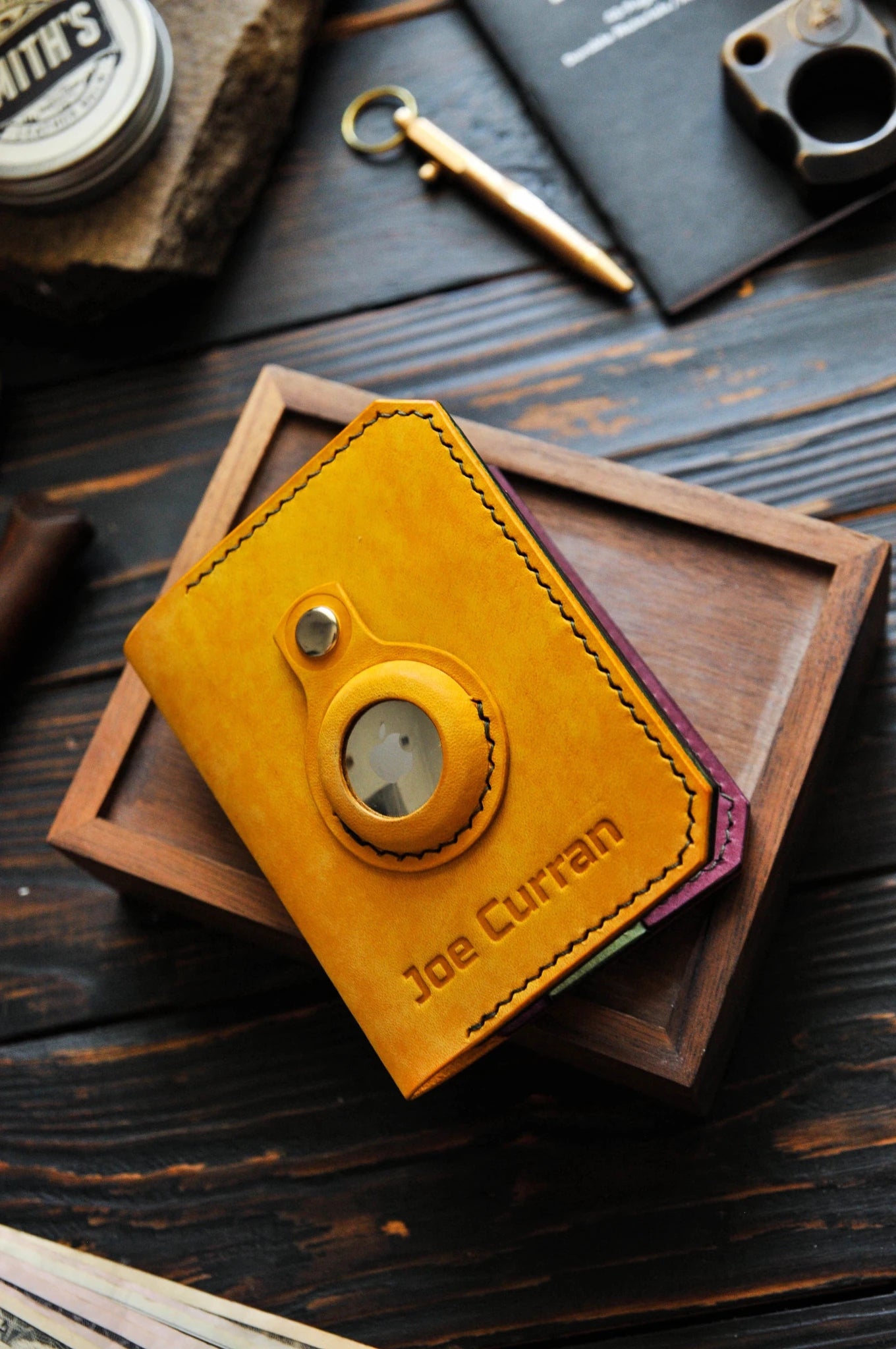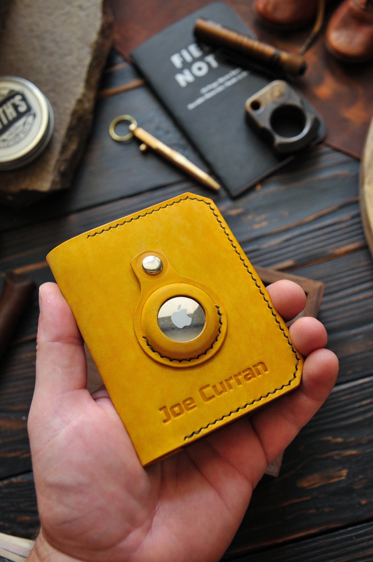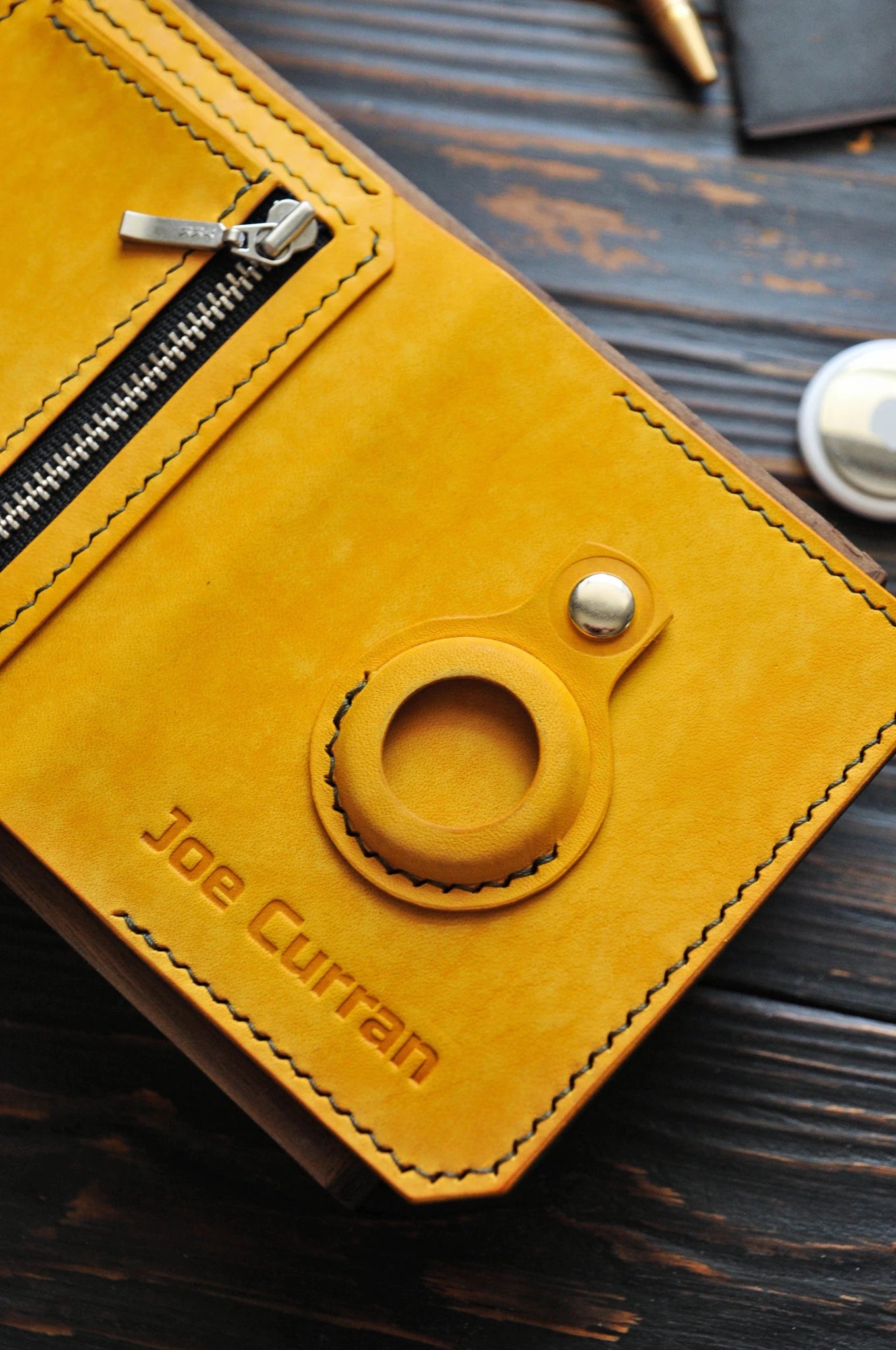 Yellow leather wallet for Apple AirTag