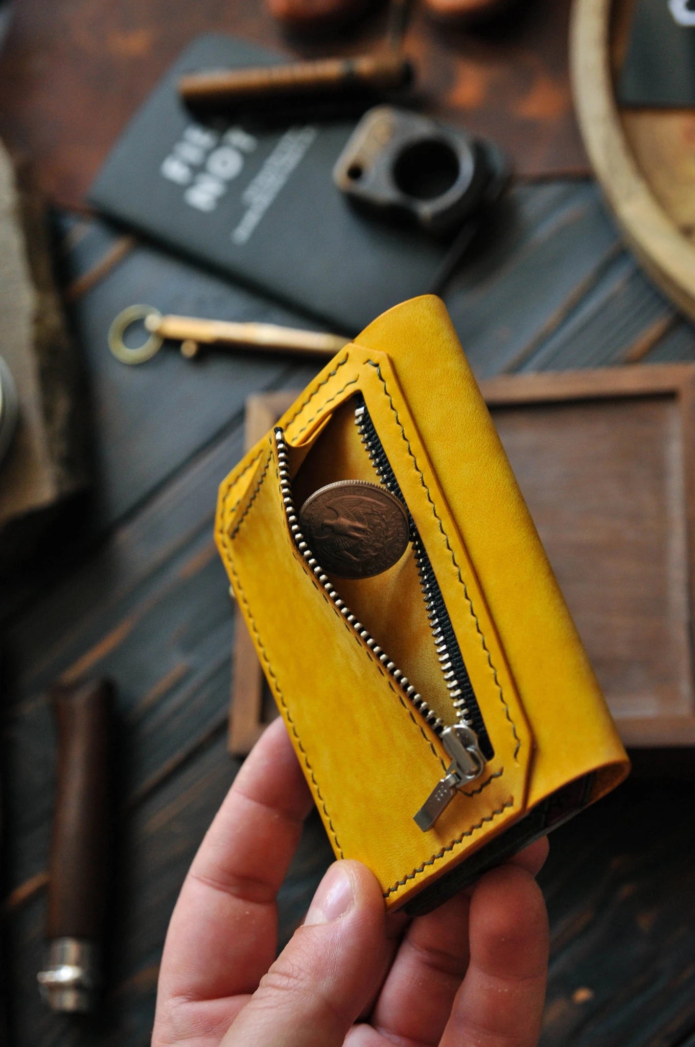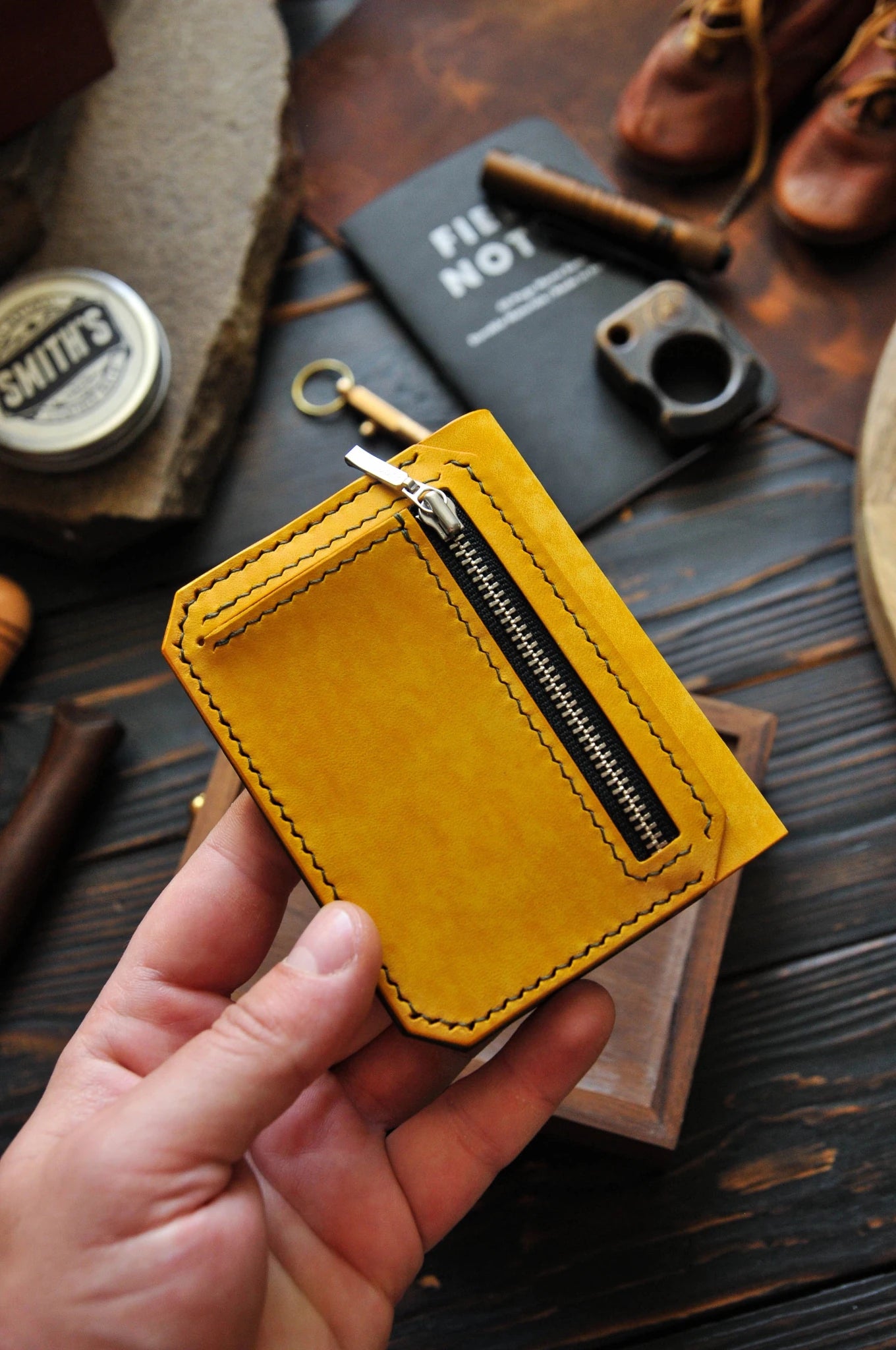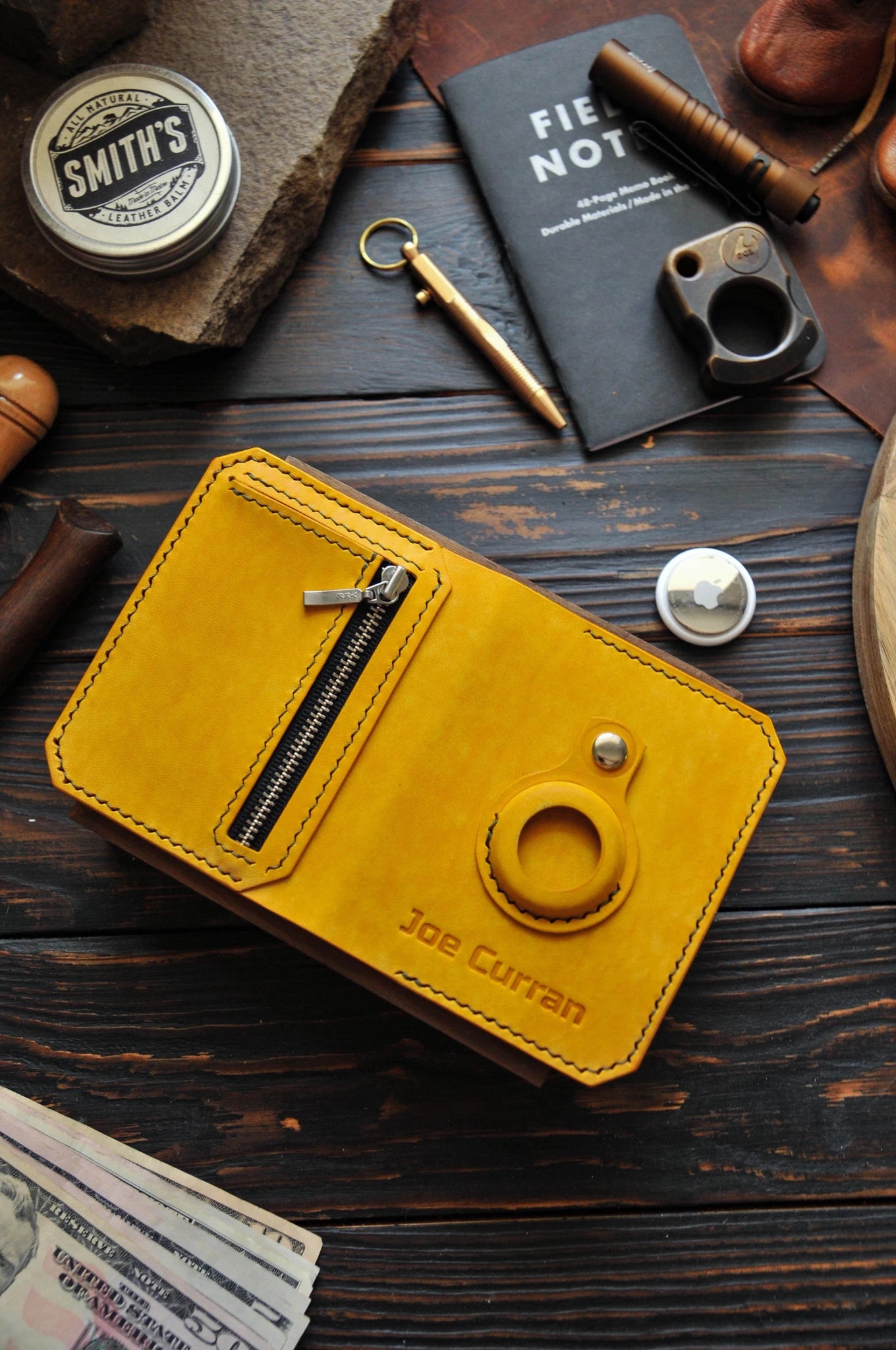 Yellow leather wallet for Apple AirTag